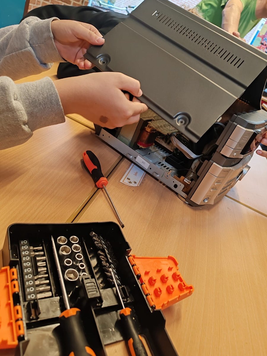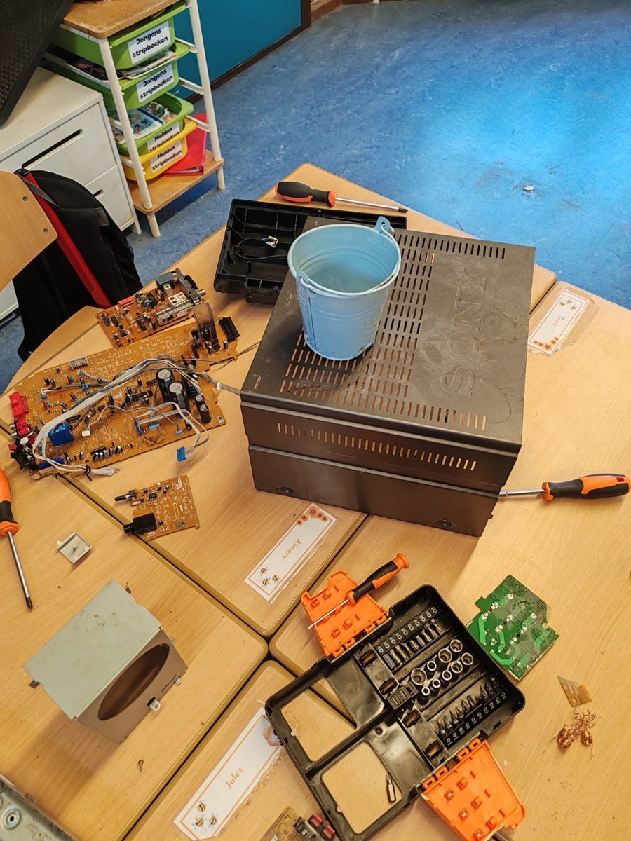 Afgelopen donderdag kregen wij bezoek van het Hertenkamp. Wij gingen met elkaar oude apparaten demonteren. Er werd gesleuteld met verschillende materialen om zo de onderdelen uit elkaar te halen en verder te bestuderen. Een leerzame doemiddag!